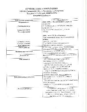 15 августа 2011 г.РЕЗЮМЕ Митрофанова Инна Петровна Вакансия: Бухгалтер Зарплата: от 16000 Дата рождения: 30.04.89 г. Национальность: русская. Адрес место жительства: г. Самара, ул. Алексея, Толстого д. 87/8, кв. 70. Тел. сот.: 8-927-689-06-86 Email: kiss358@yandex.ru Образование: Самарский государственный экономический университет. Специальность: Бухгалтерский учет, анализ и аудит. Форма обучения: очная (2006-2011 гг.) Опыт работы: * С 01.07.2009. по 30.09.2009: ОАО ВоТГК ф-л «Новокуйбышевская ТЭЦ-1». Помощник бухгалтера по расчету З/П и движения материалов : участие в проведение необходимых расчетов, обработке результатов, связанных с программным обеспечением «1С» * с 11.01.2011 по 4.04.2011 ОАО «Самараэнергоспецремонт». Бухгалтер по первичной документации: обработка первичной бухгалтерской документации в программе «1С: Подрядчик вер.7.7», сдача документов в архив. * с 01.06.2011 по 31.08.2011 Самарский филиал ЗАО «Страховая группа «УралСиб». Бухгалтер по заработной плате и банковским операциям: расчет з\п, перечисление страховых выплат и компенсаций, работа в «Банк-Клиенте», «Sap (PHR)», «1С: Страхование вер.8», подготовка и сдача отчетности в органы Статистики, Пенсионный фонд, Фонд Социального страхования. Специальные знания: Уверенный пользователь ПК: Ms Office(Word, Excel), почтовые клиенты Outlook, The Bat!, англ.язык (базовый уровень), оргтехника, работа с «Консультант +», «Гарант», Программа 1С-Бухучет 7.7., 1С: вер.8, «SAP (PHR)», «Клиент-Банк», «ПУ 5». Деловые качества: пунктуальность, исполнительность, аккуратность, ответственность, целеустремленность, серьезное отношение к работе. Личные качества: Коммуникабельность, обучаемость, постоянно повышаю образовательный уровень, без в/п. Семейное положение: Не замужем.